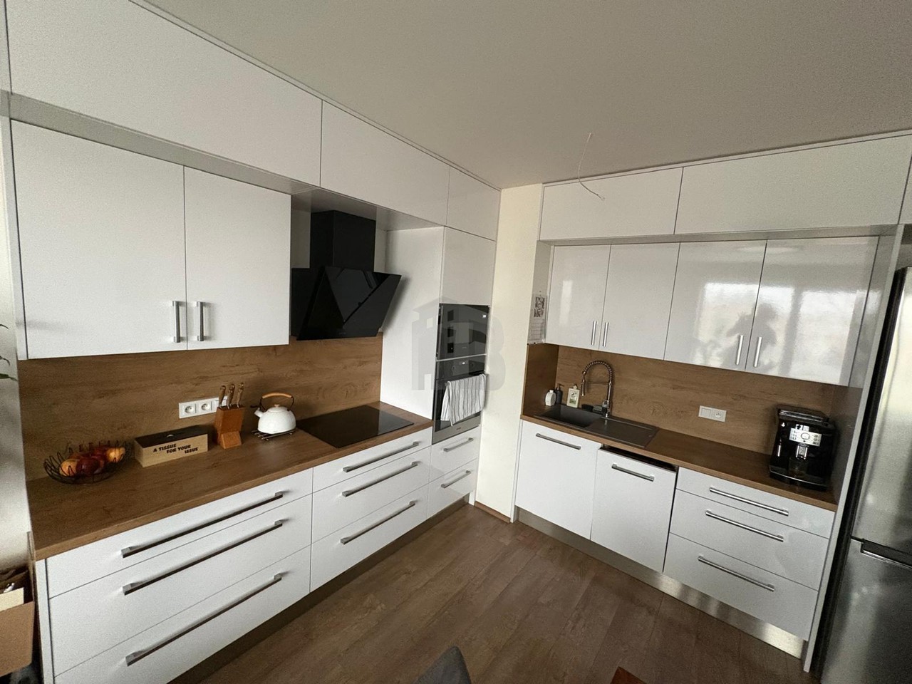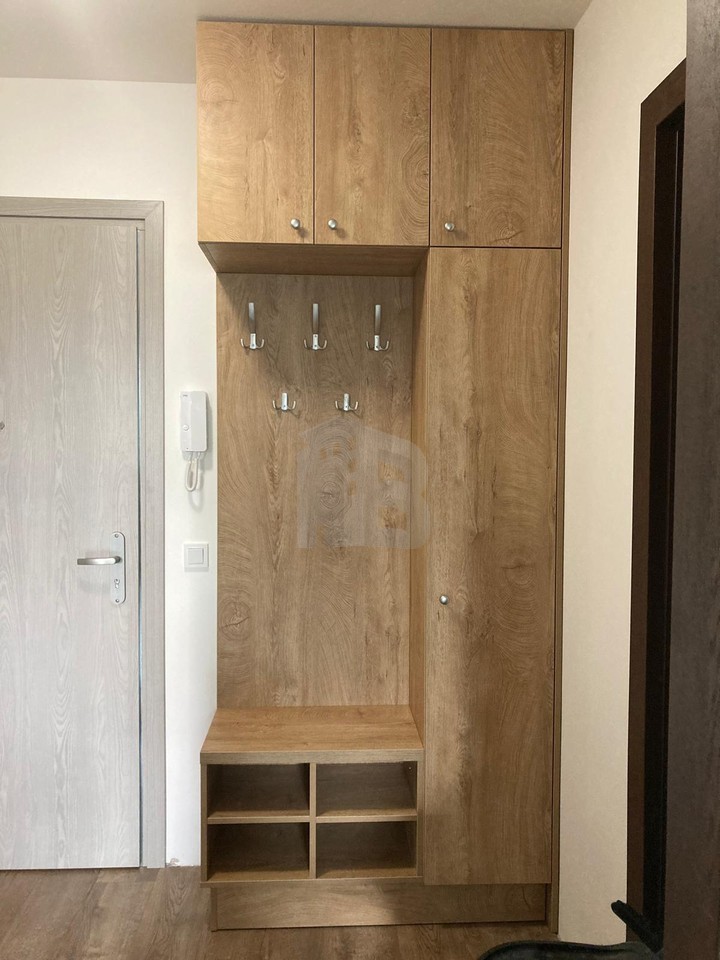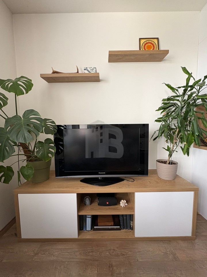 Interiér je vybaven nábytkem na míru – k dispozici jsou vestavěné skříně, plně zařízená kuchyňská linka, gauč, obývací stěna, jídelní stůl a židle. Součá...
