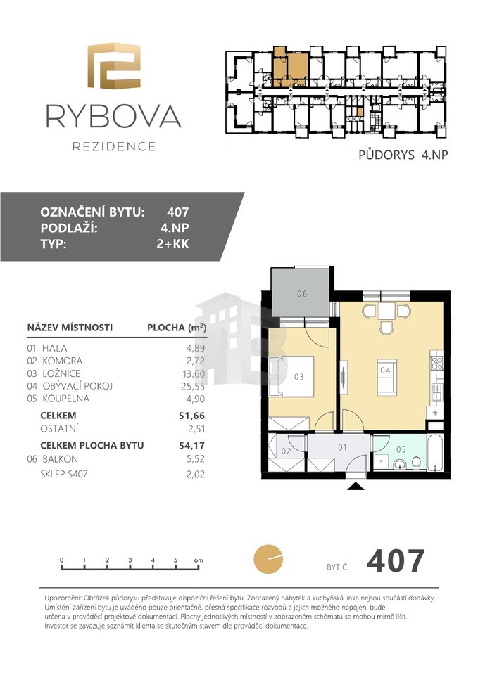 Byt o užitné ploše 52 m² se nachází ve 3. patře domu s výtahem. K bytu náleží balkon o velikosti 5,5 m² a sklep (2 m²) umístěný přímo na patře.